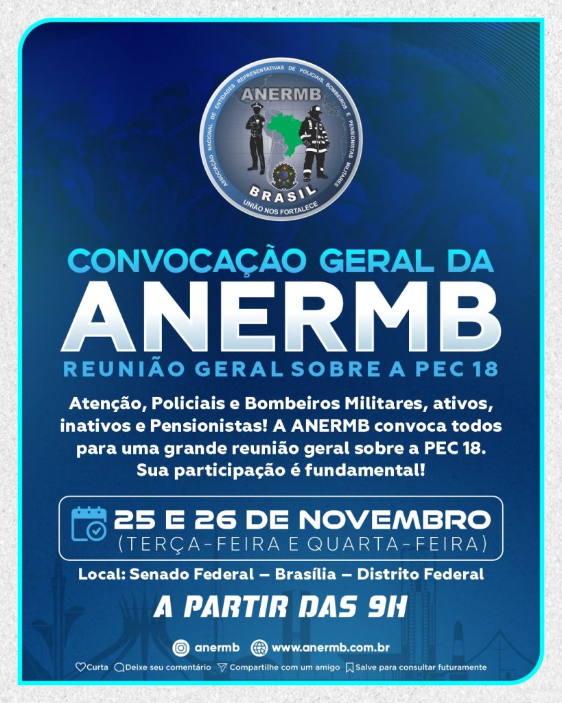 A ANERMB convida policiais e bombeiros militares (ativos e veteranos) e pensionistas para uma grande reunião nacional sobre a PEC 18. Nos dias 25 e 26 de novembro (terça e quarta-feira) no Senado Federal, em Brasília. Sua presença é essencial para fortalecer nossa categoria e defender nossos direitos!